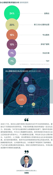 从行业需求看,金融业于本季度显着回暖,以24%的租赁面积占比跃居首位,需求主要来自保险和证券类企业的扩张与升级。第三方办公服务运营商占比20%,位列第二,其中联合办公空间运营商表现活跃。专业服务业(15%)及房地产业(13%)需求稳定,TMT行业占比为7%。板块活跃度方面,本季度河西板块依旧领跑市场,占比达49%;新街口位居次席,占比35%。从成交结构看,500平方米以下的中小面积段交易占比高达69%,凸显中小企业仍是市场需求主力。搬迁类交易占据绝对主导,占比达81%,升级搬迁和基于租金性价比的跨区域置换是主要动因。新设办公需求占比17%,主要集中在金融、第三方办公服务及消费品制造业。